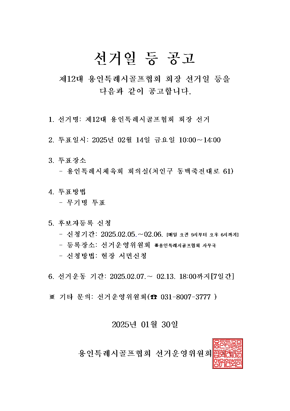 공지사항 [제12대 용인특례시골프협회 회장 선거] 선거일 공고 작성자 yoou03 작성일 2025-01-30 09:59 조회 231 임원의 결격 사유 등 자세한 내용은 첨부파일을 참고하세요 좋아요 0 싫어요 0 인쇄 골프협회-회장-선거일-공고.pdf 임원의-결격사유.pdf 전체 0 추천순 작성순 최신순 작성자 비밀번호 사진 첨부파일 « 개인정보 수집과 이용 및 제공에 관한 동의서 요청 제12대 용인특례시골프협회 회장 선거 선거인명부 » 목록보기 답글쓰기 글수정 글삭제 Powered by KBoard