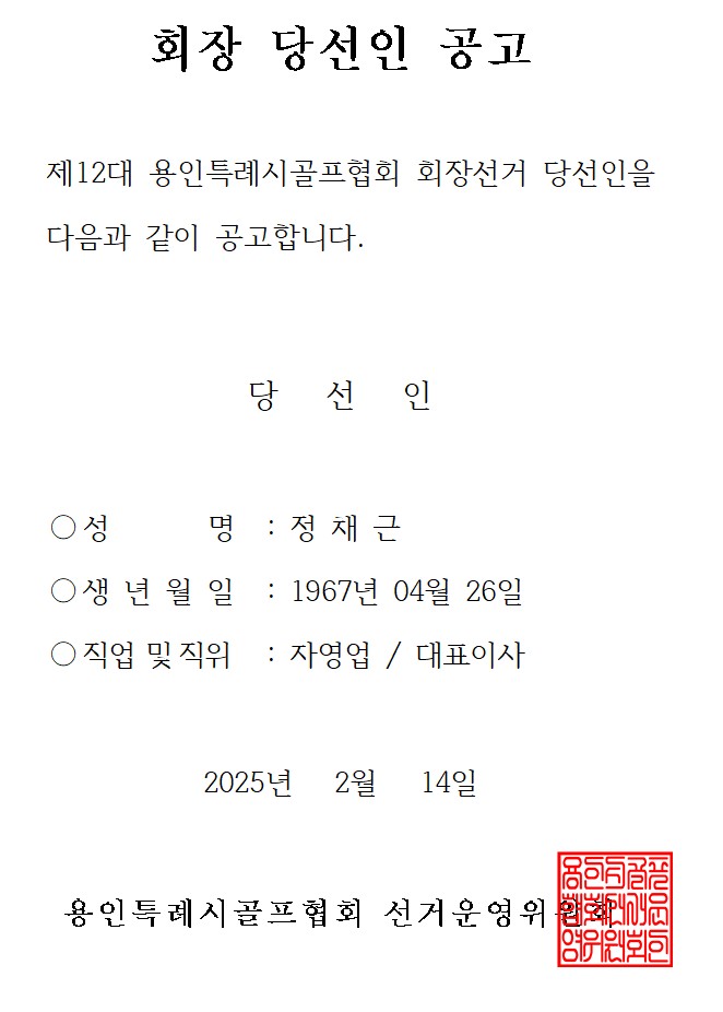 공지사항 공고-제12대 용인특례시골프협회 회장 선거 당선인 작성자 yoou03 작성일 2025-02-14 09:51 조회 309 좋아요 0 싫어요 0 인쇄 전체 1 추천순 작성순 최신순 yoou03 2025-02-14 09:52 당선을 축하드립니다! 삭제 편집 답글 좋아요 0 싫어요 0 작성자 비밀번호 사진 첨부파일 « 2025년 용인특례시골프협회 정기이사회 개최 공지 2025 용인특례시골프협회 정기대의원총회 개최공지 » 목록보기 답글쓰기 글수정 글삭제 Powered by KBoard