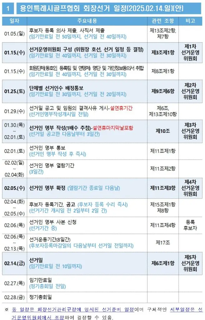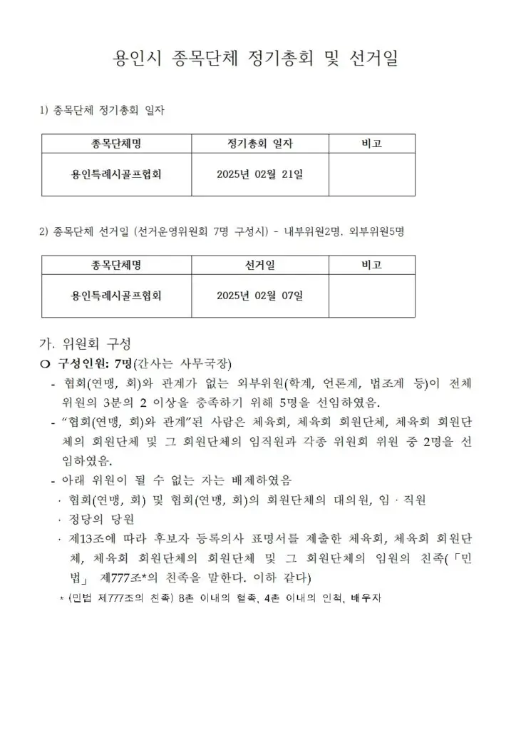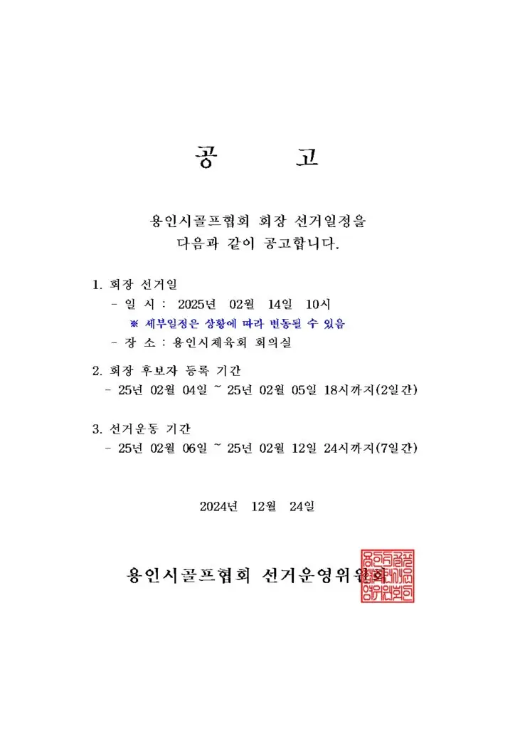 용인특례시골프협회 사무국에서는 용인특례시골프협회 정관 및 회장선거관리 규정에 따라 임시이사회를 개최될 수 있도록 지원하였으며, 정해진 절차에 따라 임시이사회에서 의결한 2025년 정기대의원총회 일자, 제12대 용인특례시골프협회 회장 선거일, 선거운영위원회 구성 등에 대하여 홈페이지 공지게시판을 통해 공지를 하였으며, 현재 페이지 하단에도 내용을 게시할 예정입니다.